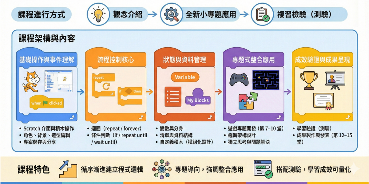 專題導向整合實作 | 以專題方式整合所有程式概念,完成具互動性與完整規則的 Scratch 作品。 |